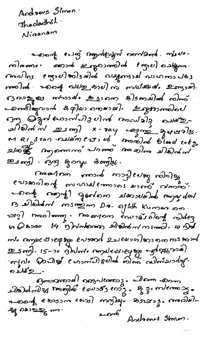 I am Andrew Simon from Niranam. I am working in Gujarat. I had a car accident and my leg became weak. I was not able to get up from bed without help. I was admitted in a big hospital in Gujarat. When they took MRI scan,they found blood clot. And started treatment for that. But I was still not ok. I came back to Kerala walking with the help of a Walker. I came to know about Ajith Kumar of Chackalayil Ayurveda Hospital through my aunt. Ajith Kumar treated me for 14 days. By the 10th day, I could walk without Walker. By the 15th day, I was completely cured and discharged.Millions of thanks to God and Dr. Ajithkumar. I am always indebted to Ajith Kumar.